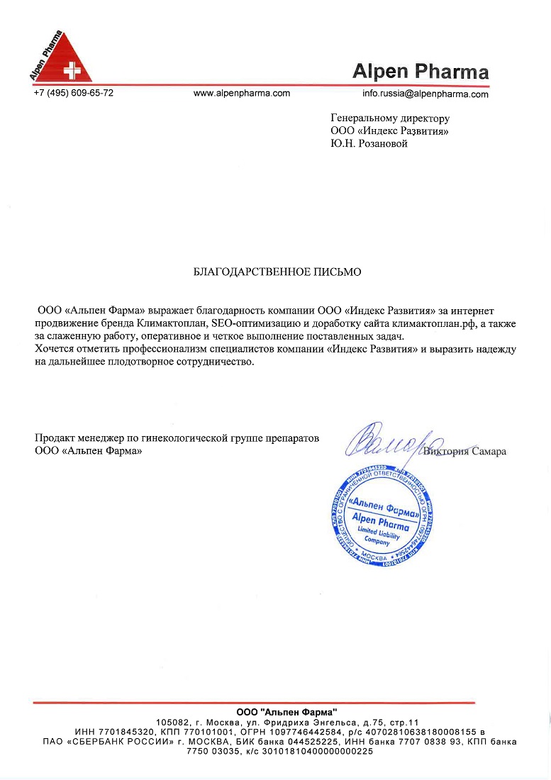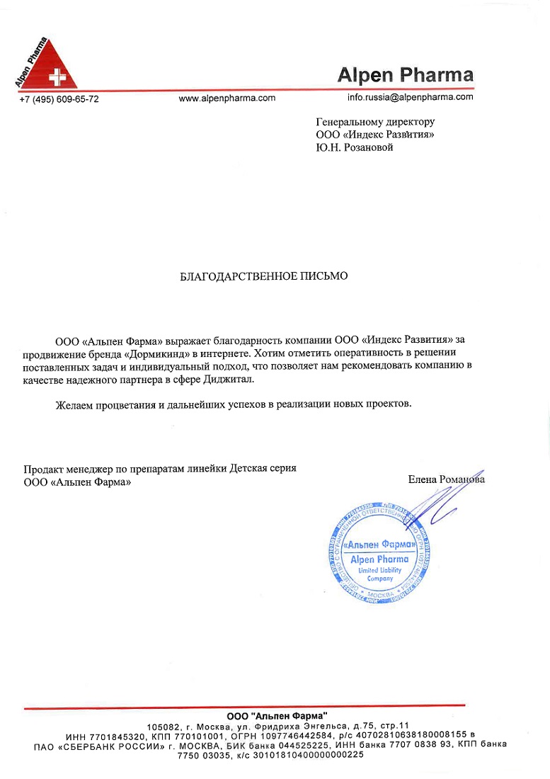 ООО "Альпен Фарма" выражает благодарность компании ООО "Индекс Развития"...