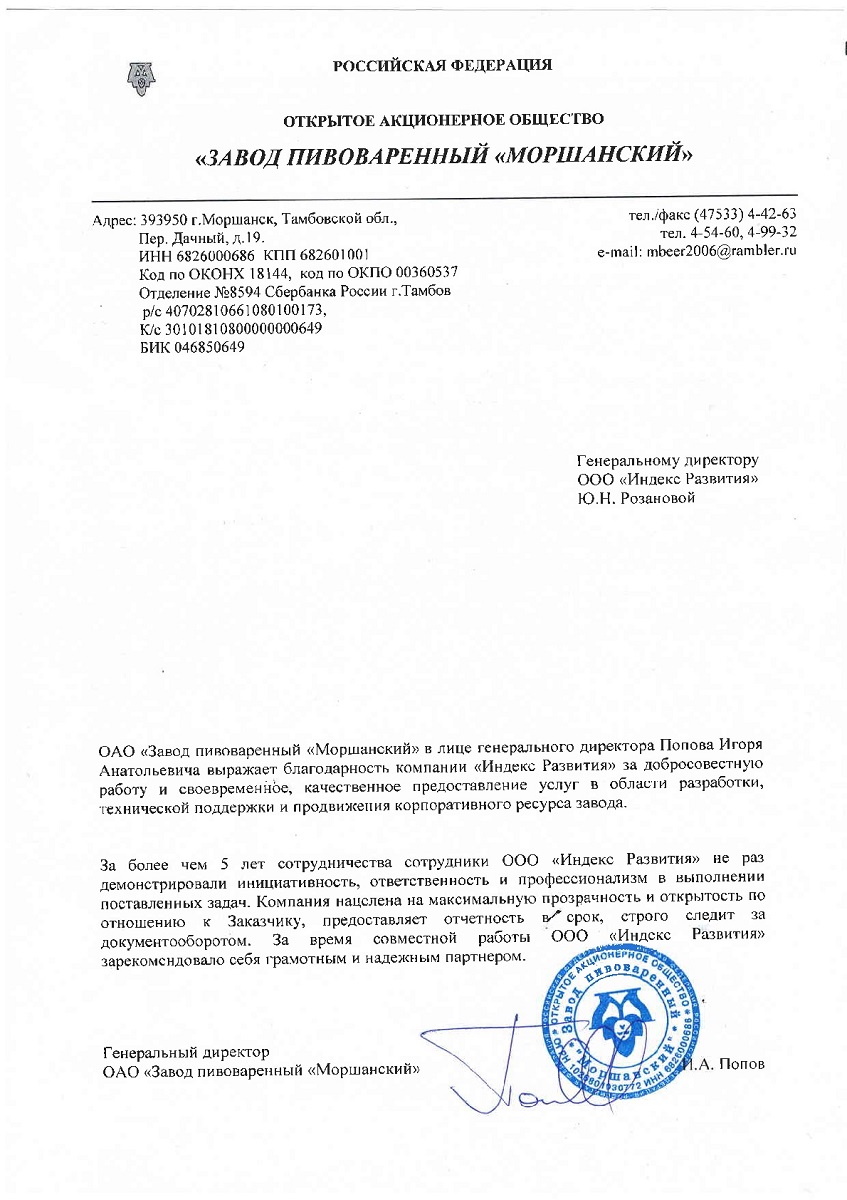 ОАО "Завод пивоваренный "Моршанский" в лице генерального директора Попова Игоря Анатольевича