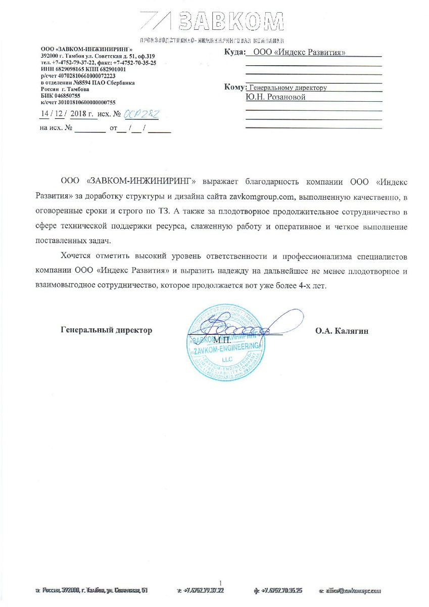 ООО "ЗАВКОМ-ИНЖИНИРИНГ" выражает благодарность компании ООО "Идекс Развития"...